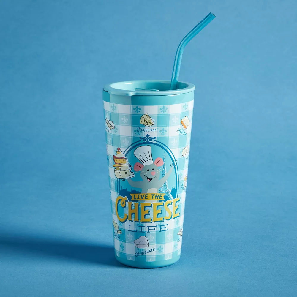 Hydratez-vous toute la journĂ©e avec ce gobelet Ratatouille colorĂ© qui porte un motif de RĂ©my et l’inscription « Live the cheese life ».